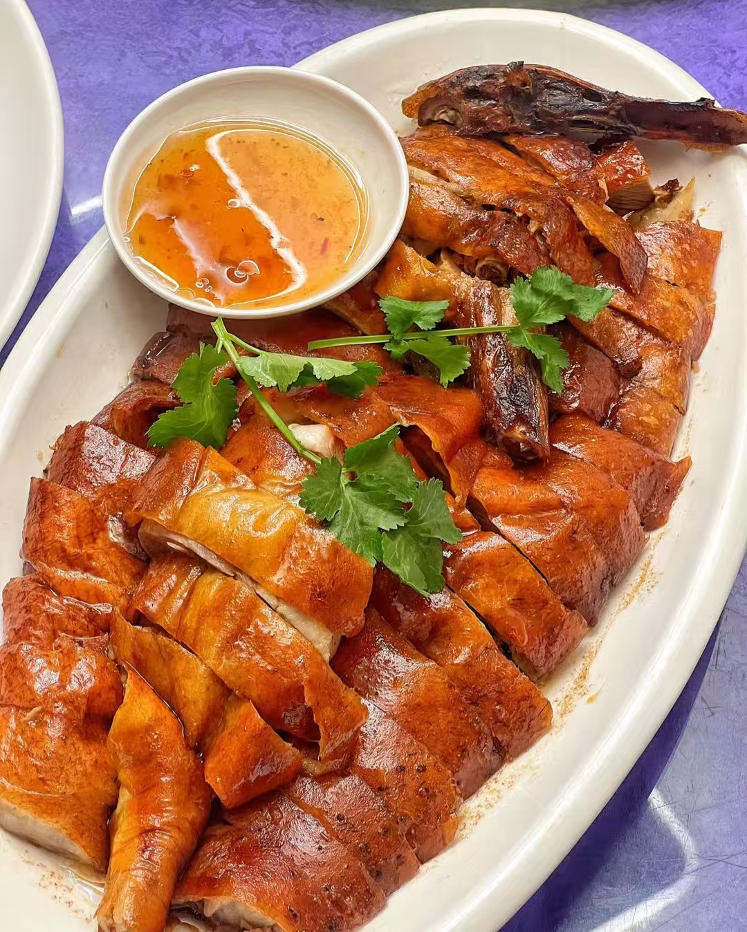Guangdong Roast Goose is a classic in Cantonese cuisine, known for its crispy skin, tender meat, golden color, and irresistible aroma 🤤. The goose is traditionally marinated and then slow-cooked over charcoal, giving it a deep, smoky flavor 🌟. Served with a special sauce, every bite is a true delight 🍽️.