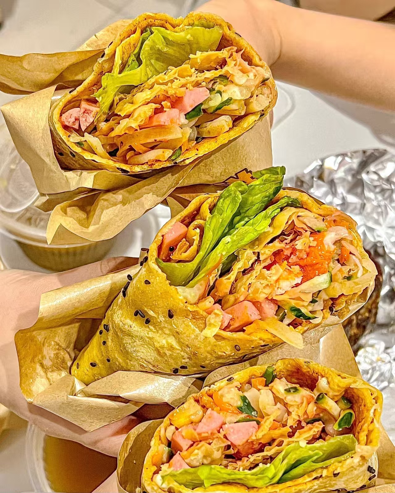 Description: A thin crepe filled with egg, sauce, and crispy bits—super flavorful!