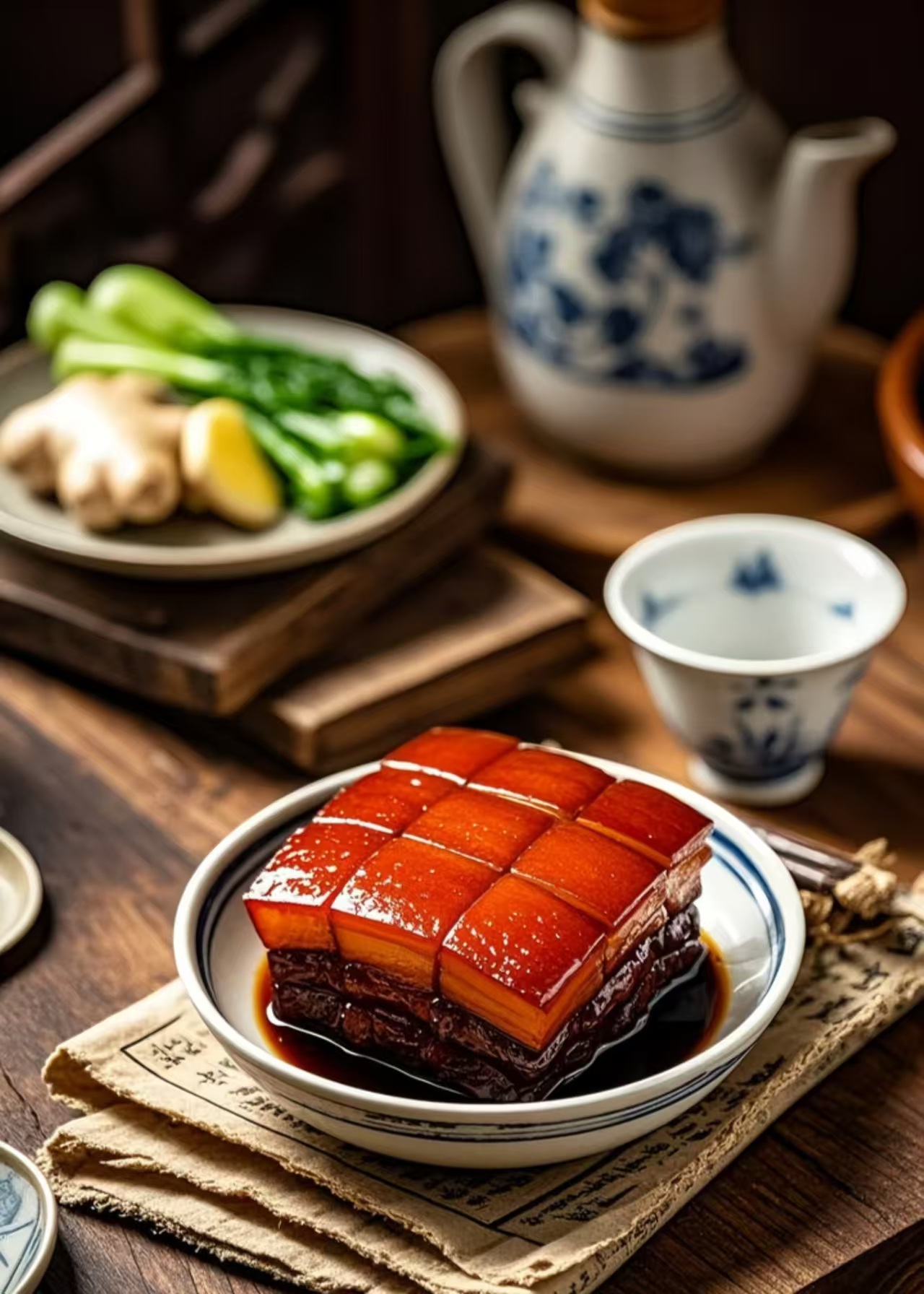 Zhejiang Dongpo Pork is a famous dish from Zhejiang, made with braised pork belly cooked in soy sauce, wine, and spices for hours. The pork is tender, melts in your mouth, and has a rich, savory flavor 🍴. This dish is named after Su Dongpo, a famous poet from the Song Dynasty, who is said to have created it 🏯.